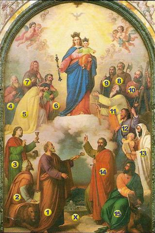 | 1. St. Peter, the Apostle holds "the Keys of the Kingdom of Heaven" as promised by Jesus. 2. St. Mark the Evangelist. His symbol is the Lion. 3. St. John the Apostle, Evangelist; the Beloved Disciple. The Eagle is his symbol. 4. St. Batholomew, Apostle holding an axe the symbol of his martyrdom. 5. St. Thomas, the Apostle of India was killed by a lance. 6. St. Simon, Apostle, the fish is his symbol. 7. St. Matthias, Apostle, was stoned to death. 8. St. Jude Thaddeus, Apostle, was beheaded and holds a sword.